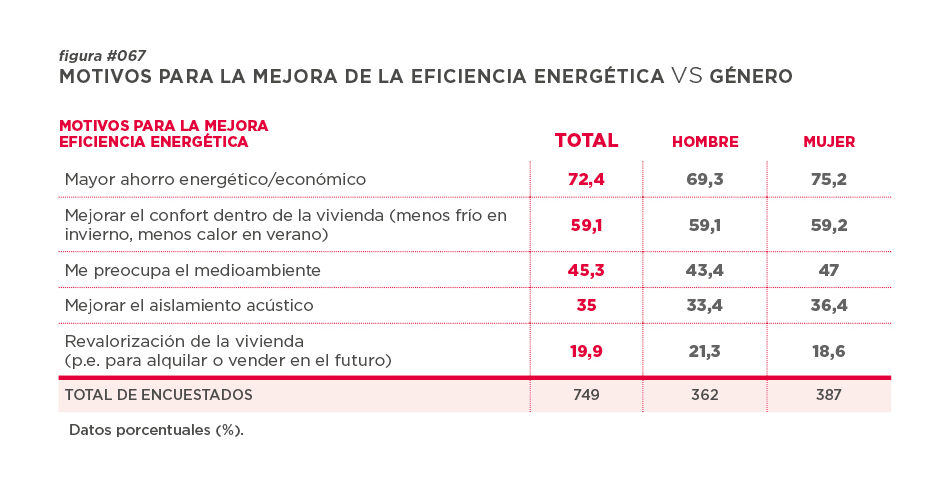 El ahorro (mayor ahorro energético/ económico) es la motivación más habitual (72,4%), si bien es el propio confort interior de la vivienda (menos frío en invierno, menos calor en verano) lo que puede motivar a la toma de la decisión de prácticamente al 60% de la población.