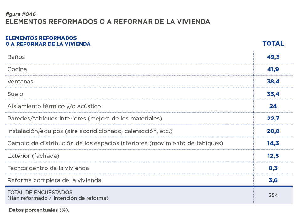Los objetivos principales de la reforman se identifican en mayor medida con espacios concretos de la vivienda, y especialmente en baños (49,3%) y cocina (41,9%), espacios de la vivienda que son los objetivos principales de las reformas.