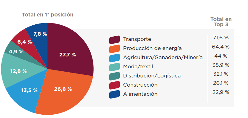 Cuando preguntamos por los tres sectores de mayor impacto en el medio ambiente, la construcción ocupa un puesto discreto en un ranking liderado por el transporte y la producción energética, que van a ocupar las dos primeras posiciones en el 72 % y 64 % de los casos respectivamente.
