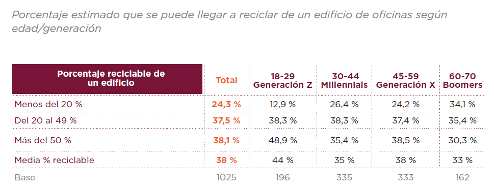 Por edad, solamente el grupo más joven, Generación Z, hace una estimación más favorable del porcentaje en el que un edificio de oficinas puede resultar reciclable, con una media del 44 %.