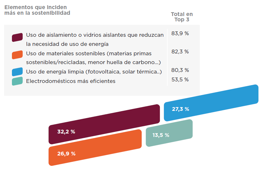 El uso de correctos sistemas de aislamiento sigue siendo el factor que más se asocia a la sostenibilidad de un edificio 1 de cada 3 entrevistados lo considera como la principal intervención sostenible.