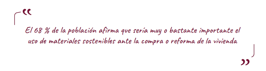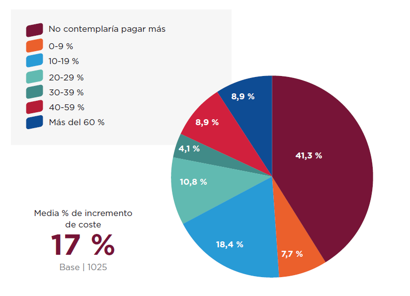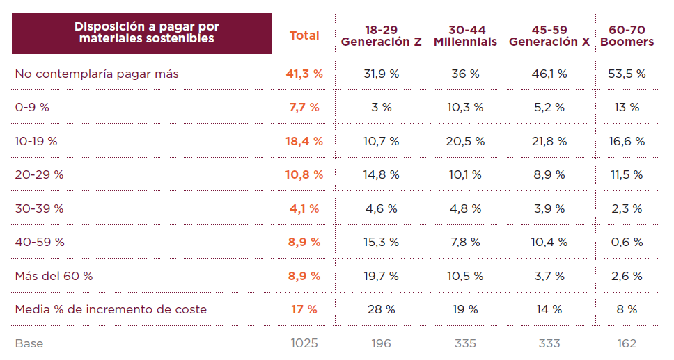 La disposición declarada a pagar un incremento de coste por el uso de materiales sostenibles disminuye en la medida en que aumenta la edad. Más de la mitad de los mayores de 60 años no estarían dispuestos a pagar nada, contrastando con los menores de 45 años donde más del 60 % asumiría un pago extra a cambio