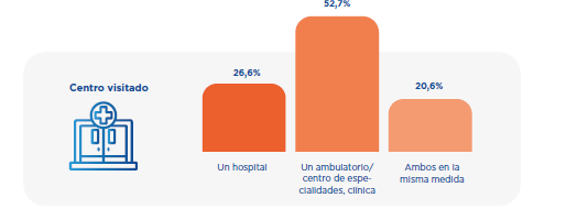 Centrándonos en sus últimas visitas, algo más de la mitad de los entrevistados acudió a un centro de centro de atención primaria o centro especializado. Uno de cada cuatro aproximadamente visitó en todos los casos un hospital y un 20% más ambos tipos de centro.