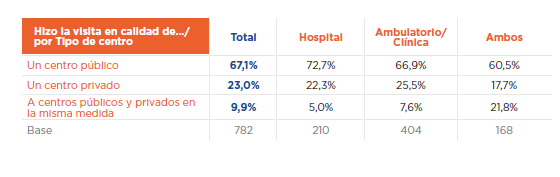 Los centros públicos concentran la mayoría de las visitas, especialmente en el ámbito hospitalario. Los usuarios que hacen un uso más intensivo de la atención sanitaria, tanto por la frecuencia como por la visita a varios tipos de centros, suelen combinar en mayor medida asistencia pública y privada.